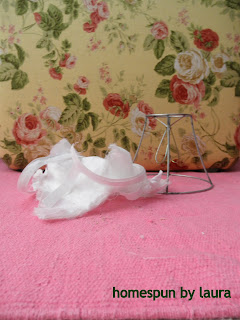 I set aside my pile of hole-y caps to cut the fabric cover off of the lampshade, leaving only the metal frame. I hated this step since this was a new frame I bought because I got impatient looking for one the right size at Goodwill.