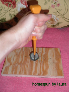 I began by hammering 4 holes along the edge of each bottle cap with the awl – top, bottom, left, and right sides.