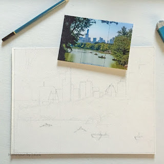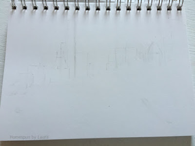 I sketched out a small version of the skyline so I could try my hand at painting buildings, which is an area where I have little experience. I simplified the skyline for my purposes but kept as many of the more unique buildings as I could.