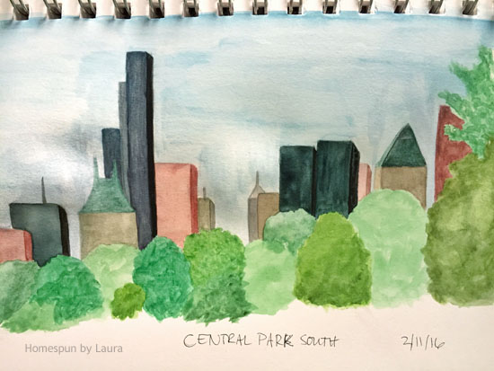 Well, I’m a week late in posting Week 6’s Doodles, so it’s time to catch up! The focus of the series of Doodles I did this week was a view of the Central Park Boating Lake with the skyline of Central Park South in the background. I took the photo during a bike ride through Central Park on our trip to NYC in August, and it made it onto my list of pictures I’d like to recreate in my Paint My Vacation series.