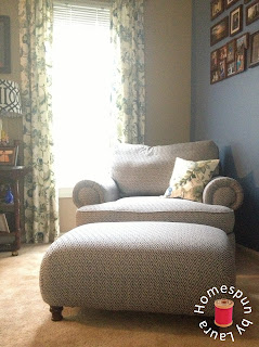 Once both the curtains and rods were complete and hung over the windows, I moved on to the biggest project yet: re-upholstering the big armchair and ottoman.