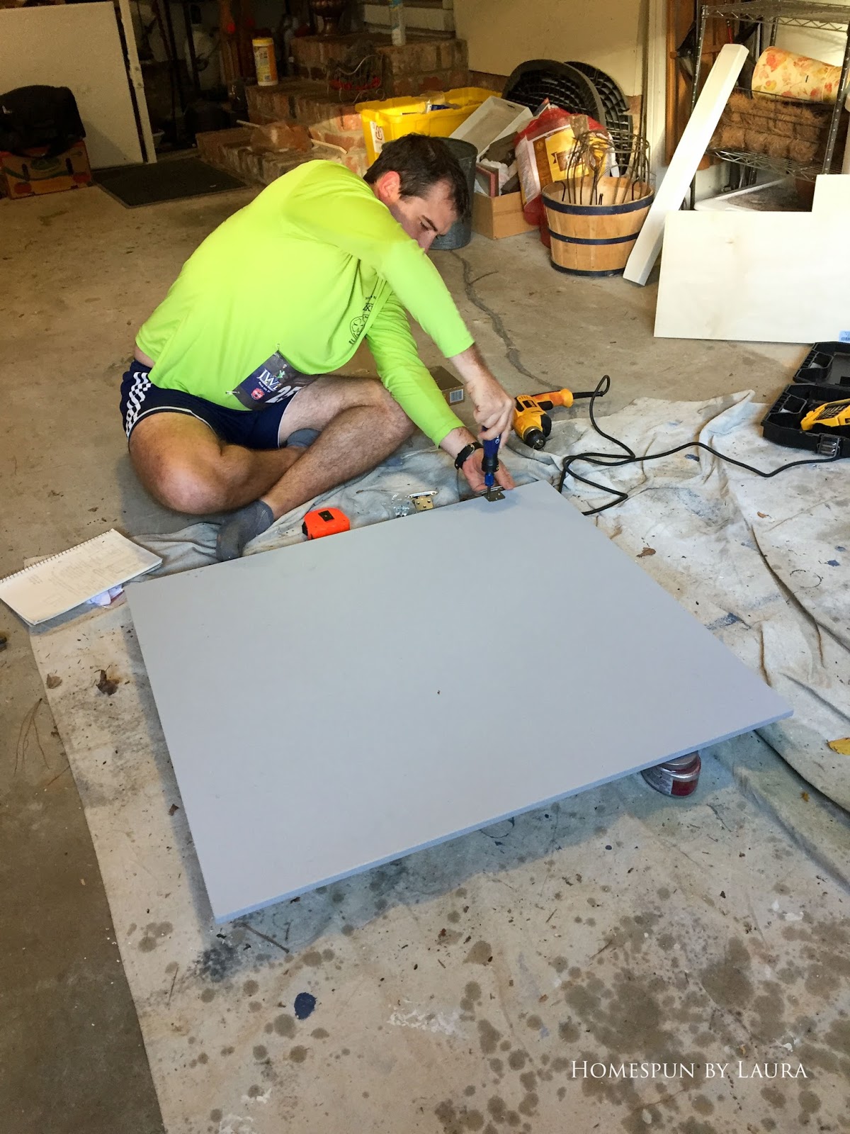 Instead, I set up shop in the garage on a rainy day to finish painting all the wood and spray paint the metal pieces, not realizing how much would need to be repainted after we assembled and hung the rack.