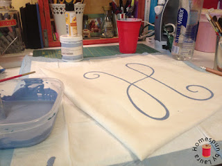 The next step was to mix up my paint. I wanted the letter to match the accent wall in the den, so I used the little sample jar we bought when we tested out colors before we painted the walls. I mixed it with textile medium (which I found at Hobby Lobby for under $2) to prepare it for being used on fabric.