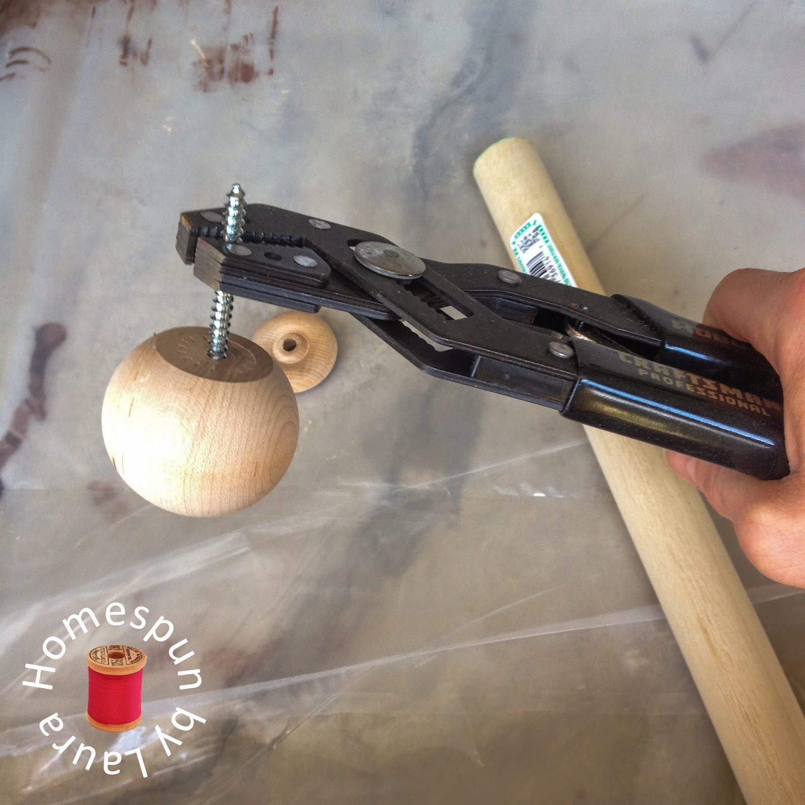 I used a vise grip to hold on to the dowel screws while I attached the doll heads to them, twisting until a little more than half the screw was still visible