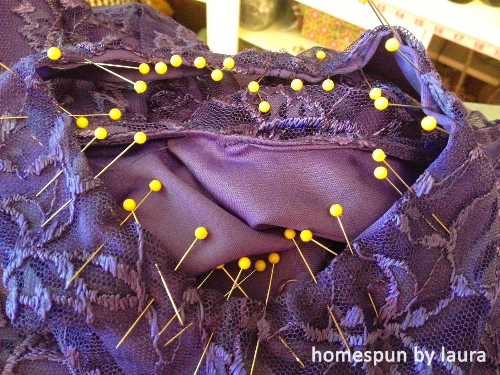 3 – I then basted both layers together at the neck, following the lines I traced out earlier. I had trouble with this step, as I kept putting the dress together in the wrong order. What turned out to be correct after a few wrong attempts was to put the RIGHT side of the lace layer facing the WRONG side of the lining. I’m not sure why I made this part so difficult on myself, but I should never forget it now! The back of the dress turned out to be more rounded than I intended (since the lining is stretchy, I suppose it stretched the V out into a U), but I decided I liked it in the end.