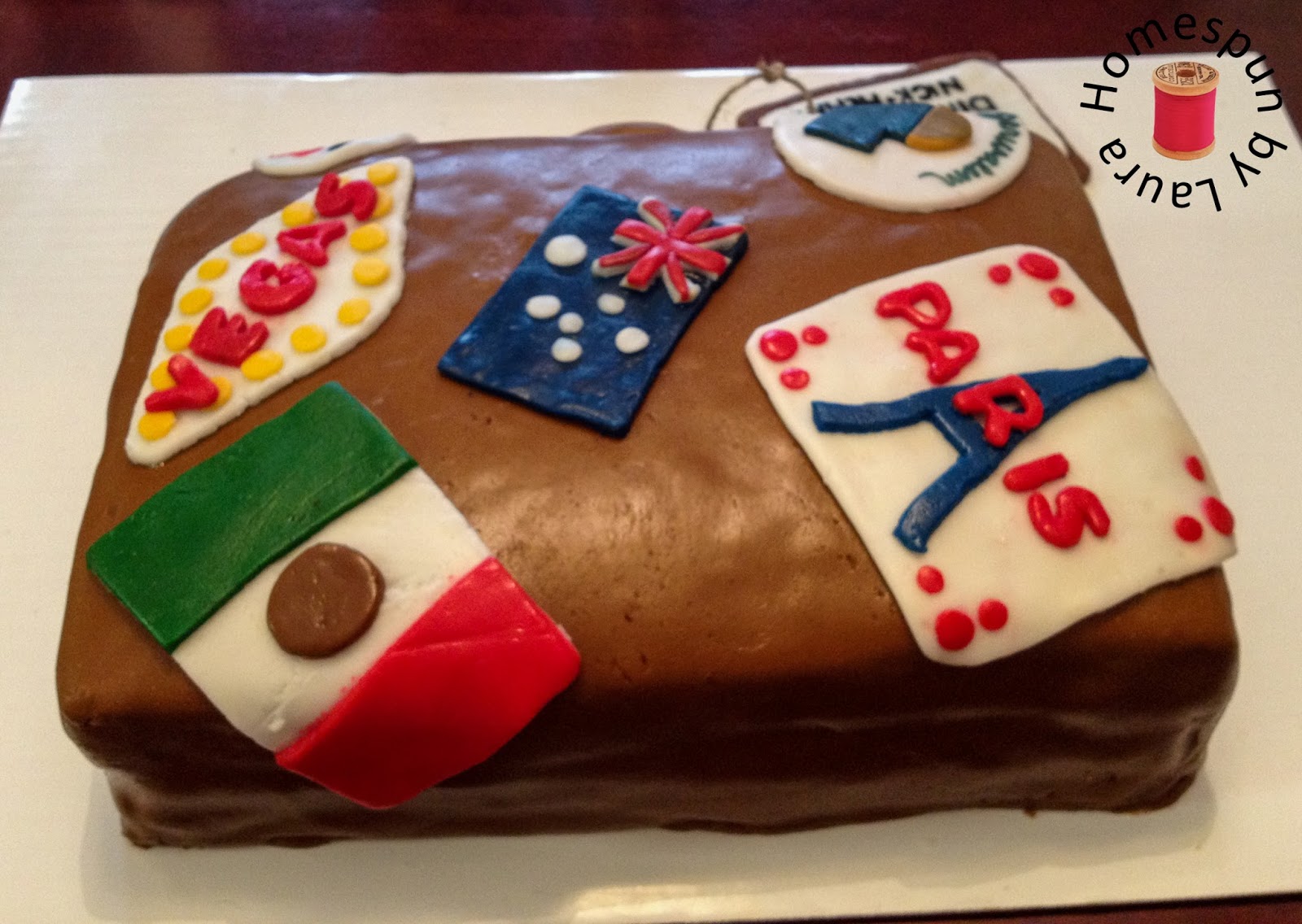 Once the thing had been made into a plain brown suitcase, I attached the souvenir stickers to the cake, again using piping gel. The last-minute addition of a luggage tag that doubled as a place to write ‘happy birthday’ finished it off.
